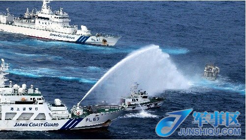 日本巡视船发射水炮拦截台湾保钓船。